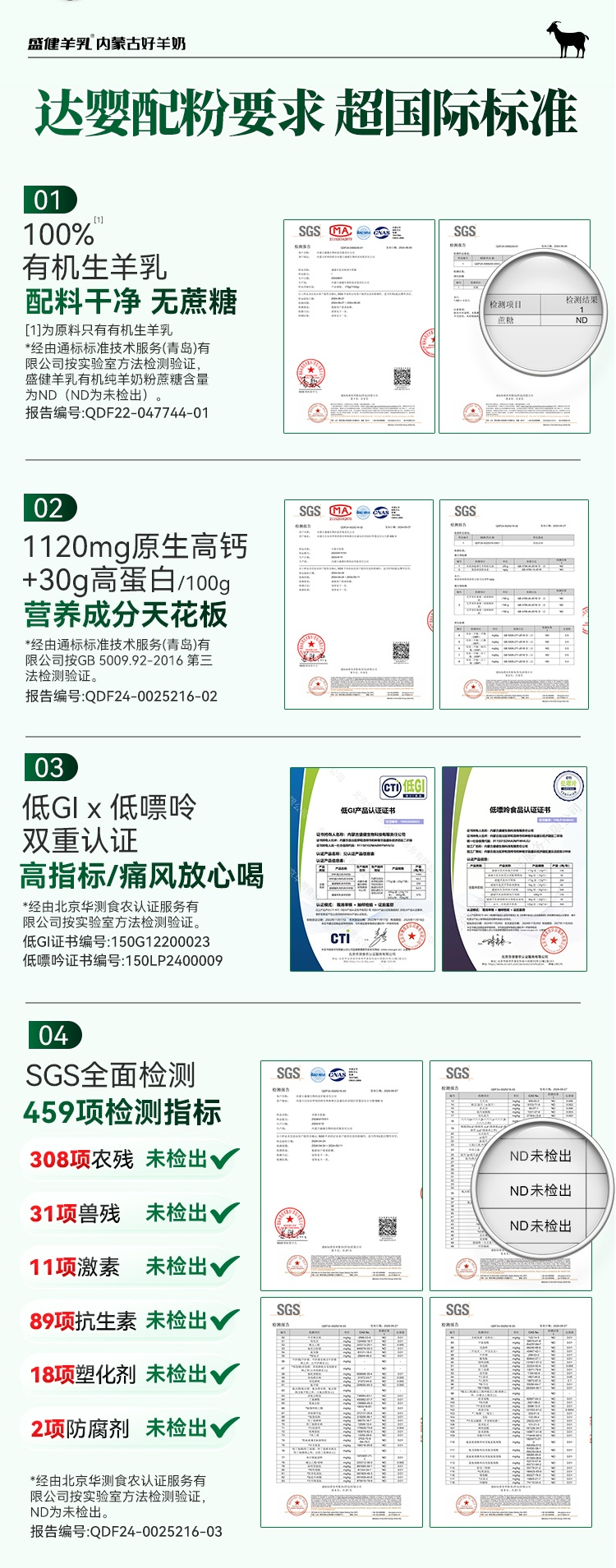 盛健斥资打造现代化智能加工厂,实现从鲜奶接收到灌装的全自动化,日处理鲜奶能力达500吨。每一批产品出厂前,都必须通过国际权威机构SGS的459项严苛检测,这份涵盖农药残留、重金属、抗生素等关键指标的检测报告,是盛健给予消费者的最硬核的品质承诺。此外,盛健已取得欧盟双认证、低GI认证,工厂获评自治区级“绿色工厂”,国际标准是其品质实力的最佳注脚。